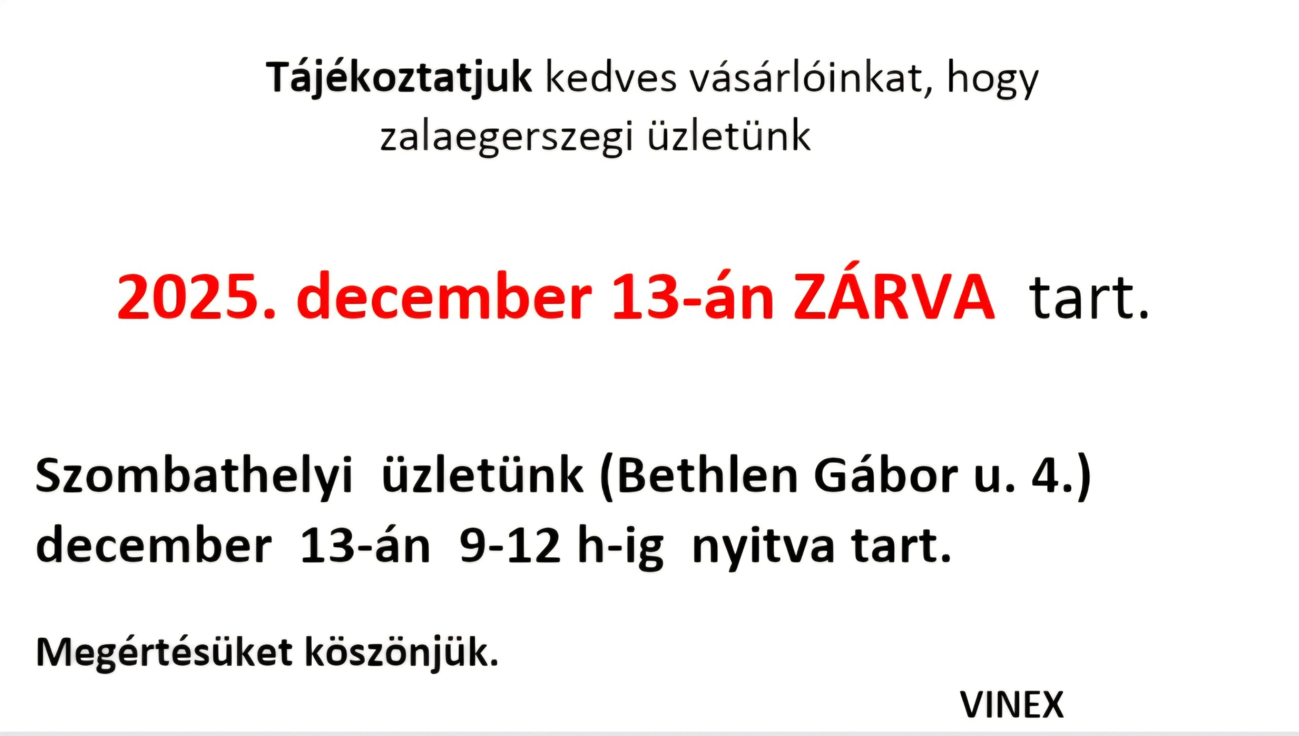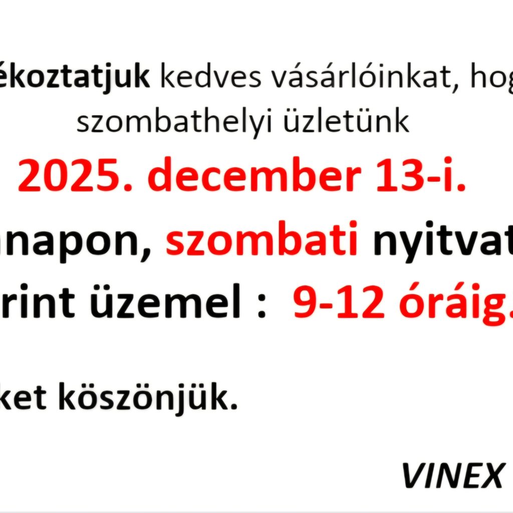 szombathelyi üzletünk december 13-i. munkanapon, szombati nyitvatartás szerint üzemel : 9-12 óráig. Megértésüket köszönjük. VINEX