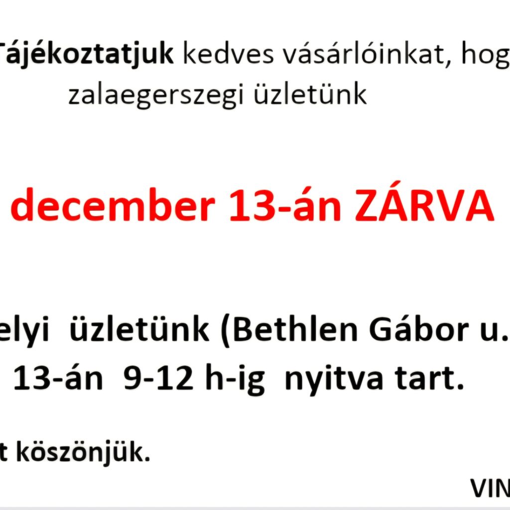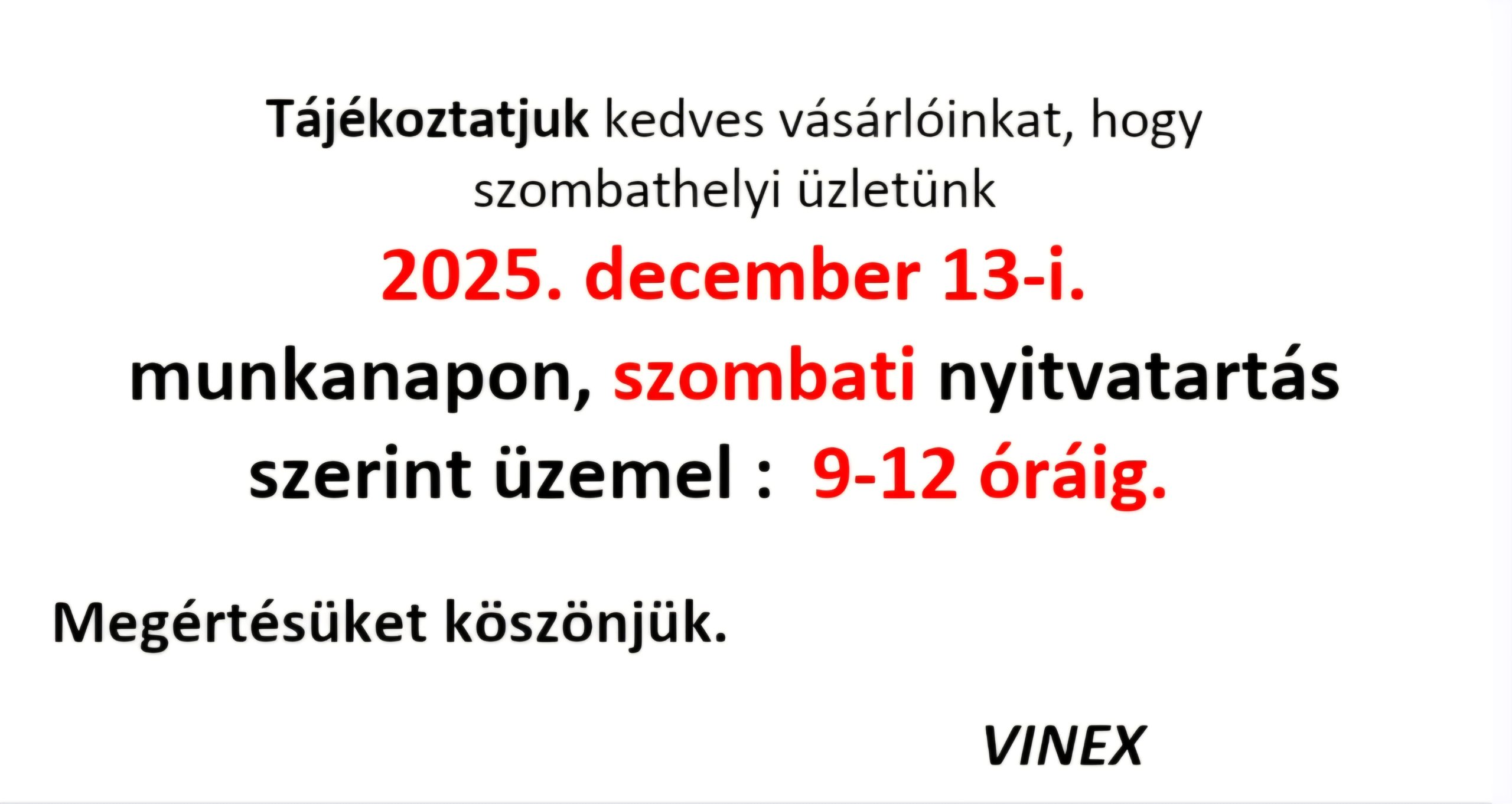 december 13-án ZÁRVA tart. Szombathelyi üzletünk (Bethlen Gábor u. 4.)december 13-án 9-12 h-ig nyitva tart. Megértésüket köszönjük. VINEX